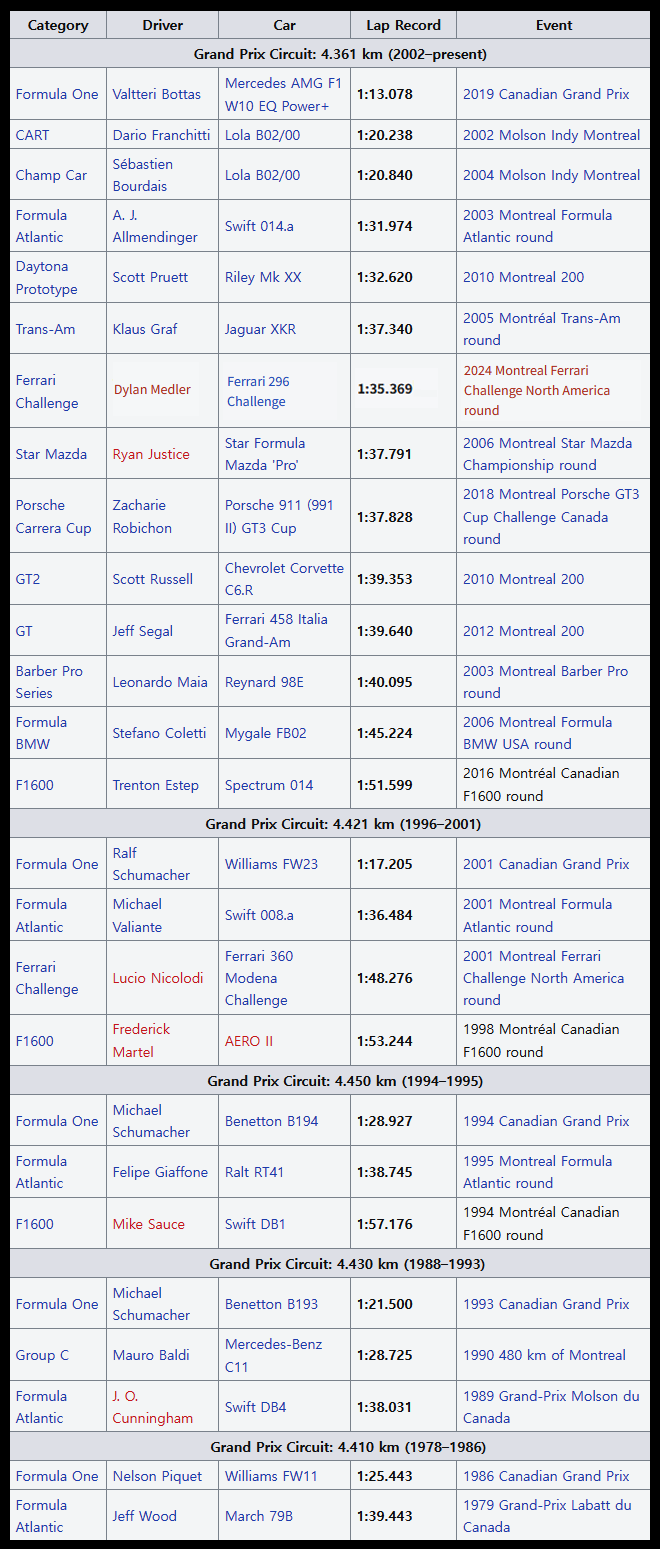 Gilles Villeneuve 서킷은 캐나다 퀘벡주 몬트리올이 위치해 있으며 14개의 코너로 이루어져 있는 4.361km의 길이의 트랙을 가지고 있습니다. 서킷은 1978년에 개장되었으며 같은 해에 처음으로 캐나다 그랑프리가 개최되었고 캐나다 출신의 '질 빌뇌브'가 페라리를 타고 우승을 차지했습니다.