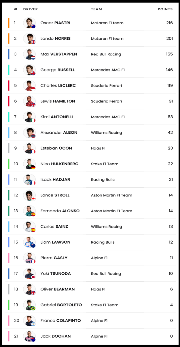 ■ 멕라렌의 노리스가 폴투윈으로 우승을 하며 시즌 3승째를 올렸고, 팀 동료인 피아스트리가 2위로 멕라렌이 원투 피니쉬를 차지했습니다. 노리스는 피아스트리와의 격차를 15포인트로 줄였고, 멕라렌은 2위인 페라리보다 거의 2배 가까운 압도적인 포인트 차이로 1위를 질주 하고 있습니다.