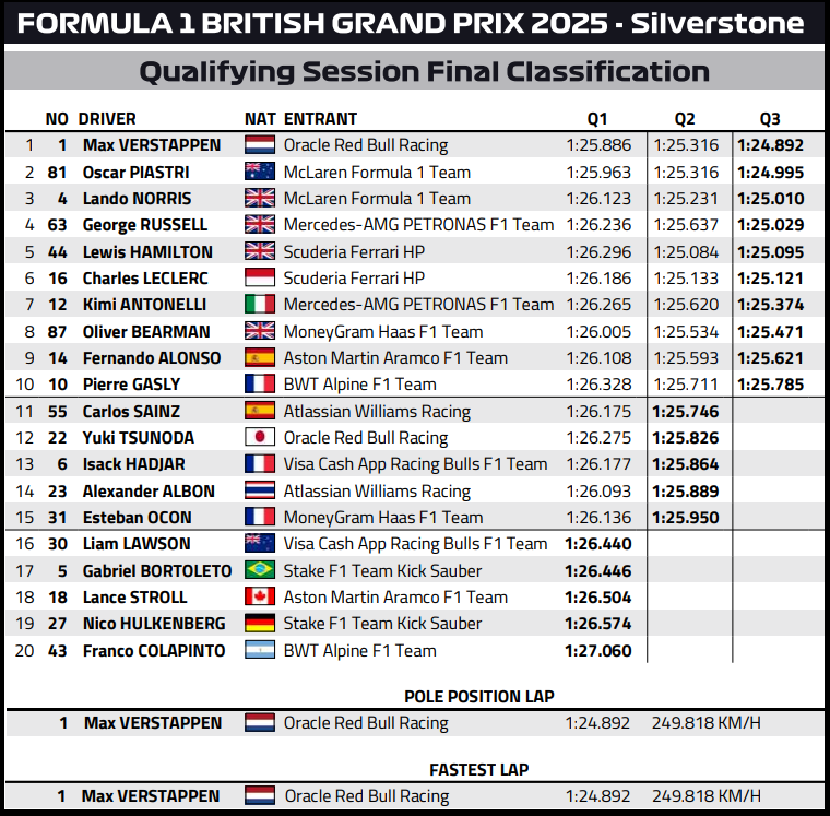 (F1 2025 British GP Qualifying Results)