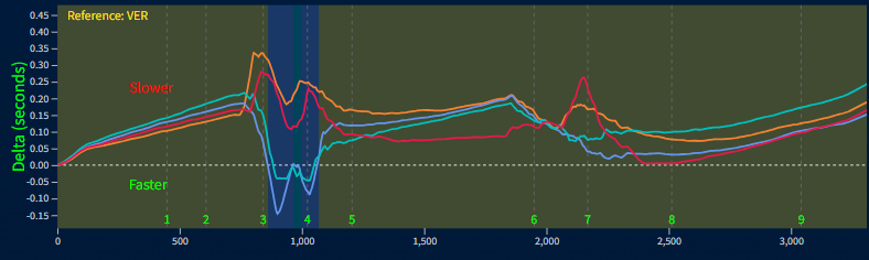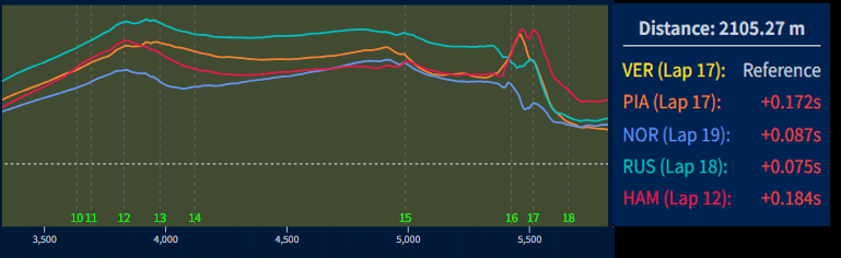 베르스타펜을 기준선으로 한 구간별 시간차 그래프 (점선이 베르스타펜)