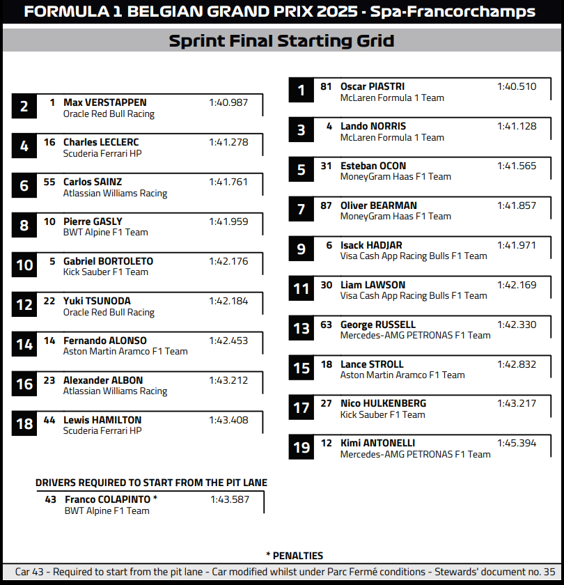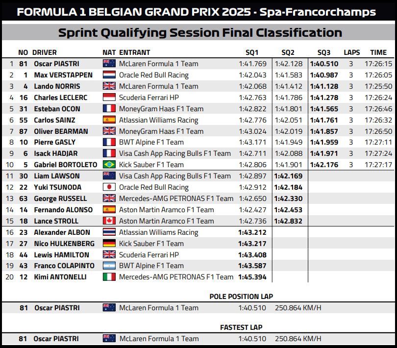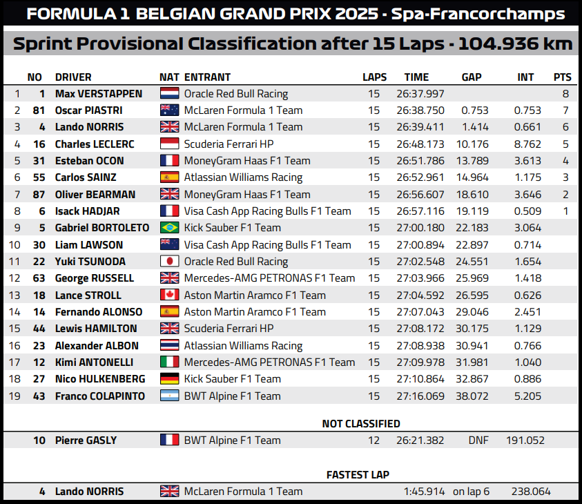 (F1 2025 Belgium GP Sprint Results)