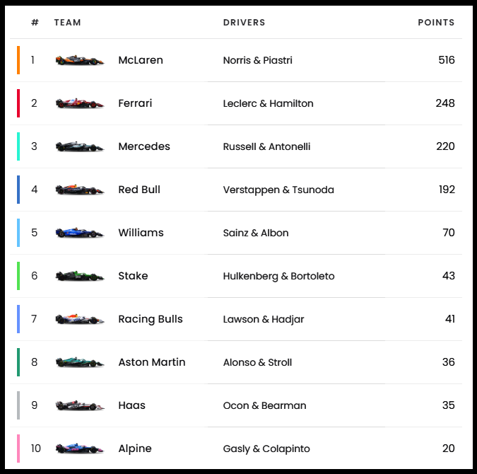 | 13 | 벨기에 GP | 베르스타펜 | 노리스 | 피아스트리 | 안토넬리 | 멕라렌 |