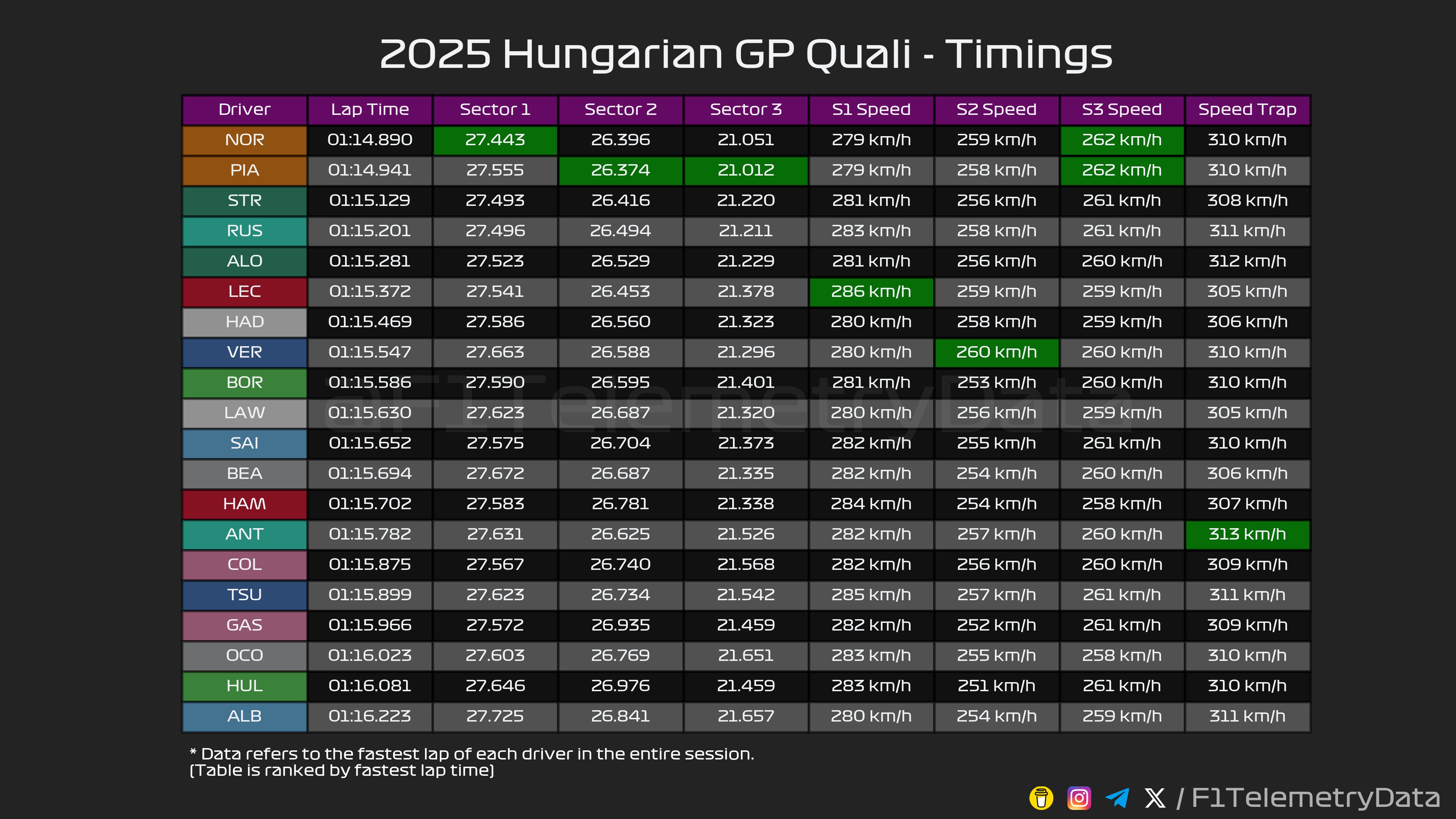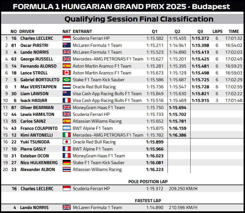 F1.2025.R14 - 헝가리 그랑프리 예선 결과