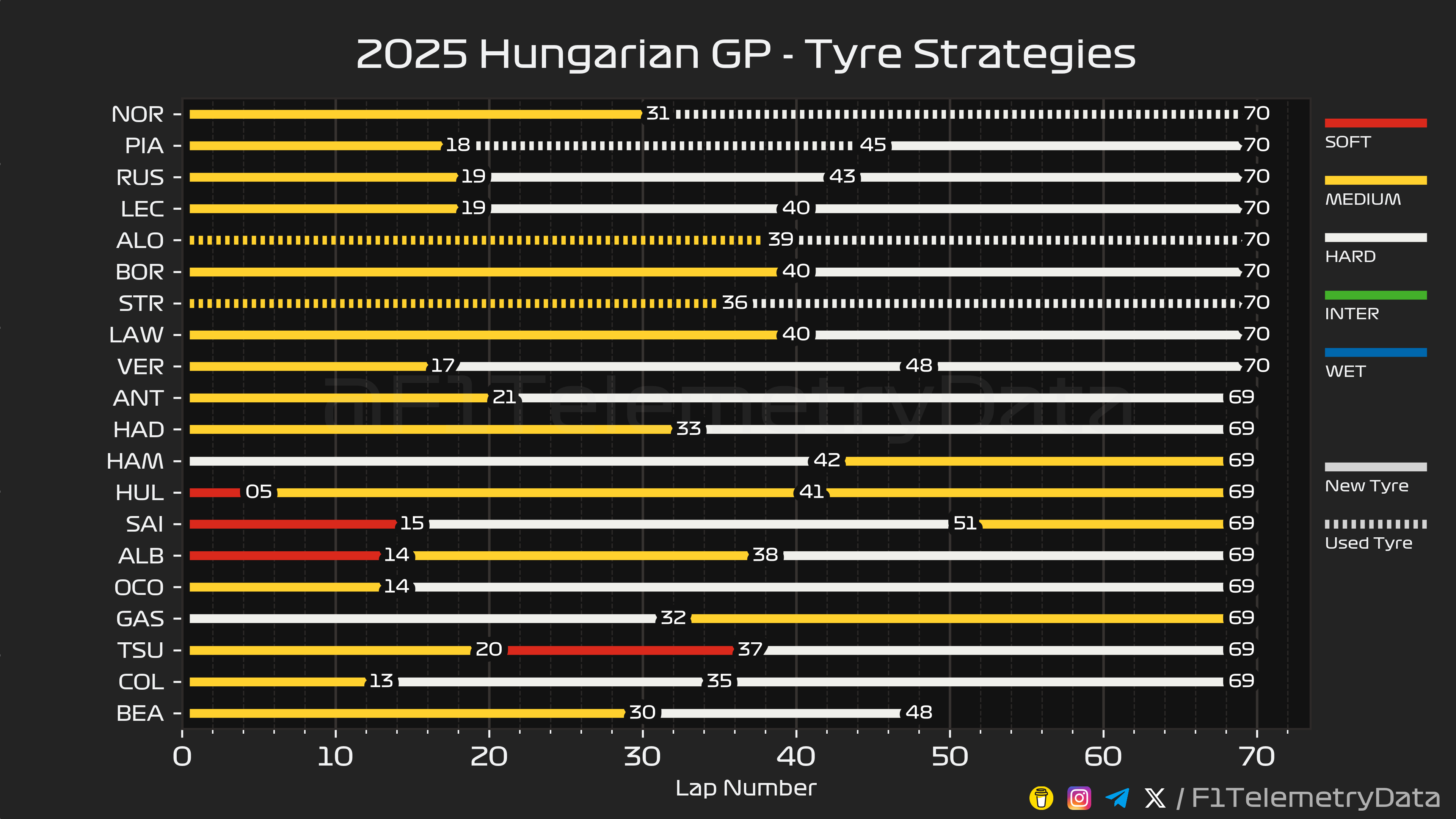 1위부터 11위까지 모두 미디어타이어를 장착했으며 12그리드의 해밀턴은 하드타이어, 13그리드의 사인츠는 소프트타이어를 장착하고 나왔습니다.