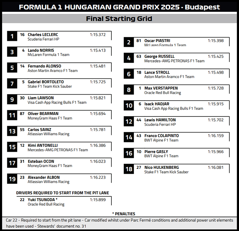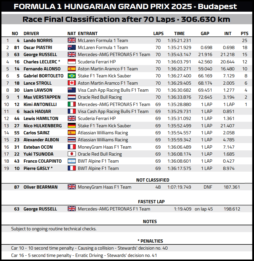 ( F1 2025 Hungary GP Race Results )
