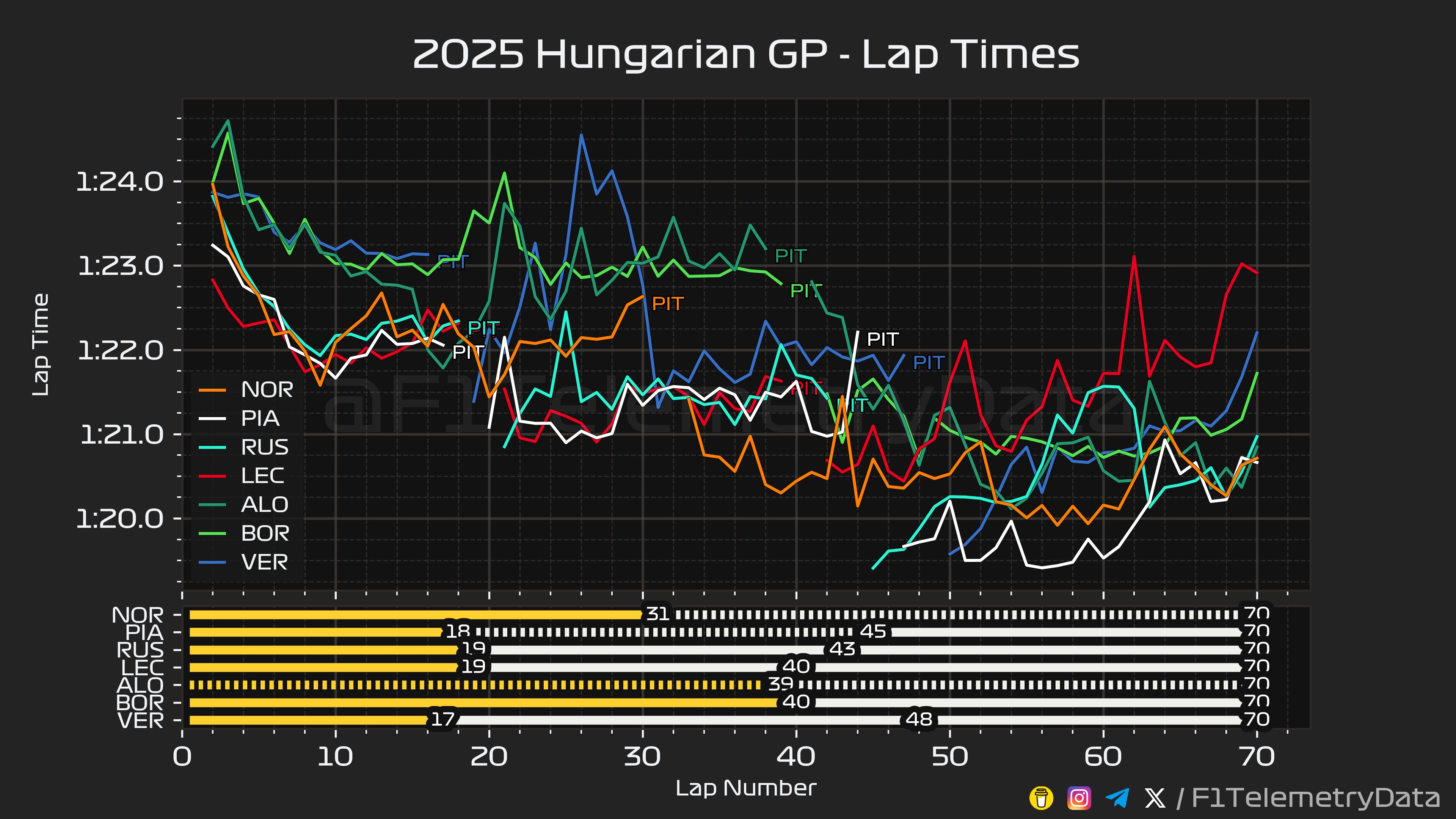 LAP 21 르끌레르 알론소 추월하며 2위. 피아스트리 패스티스트 랩. 츠노다 피트스탑 소프트타이어로 교체후 20위로 복귀.