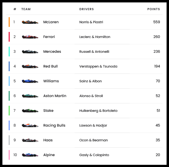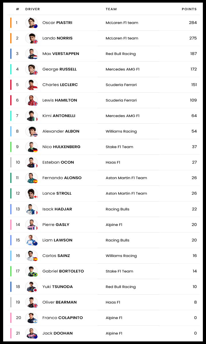 | 13 | 벨기에 GP | 베르스타펜 | 노리스 | 피아스트리 | 안토넬리 | 멕라렌 |