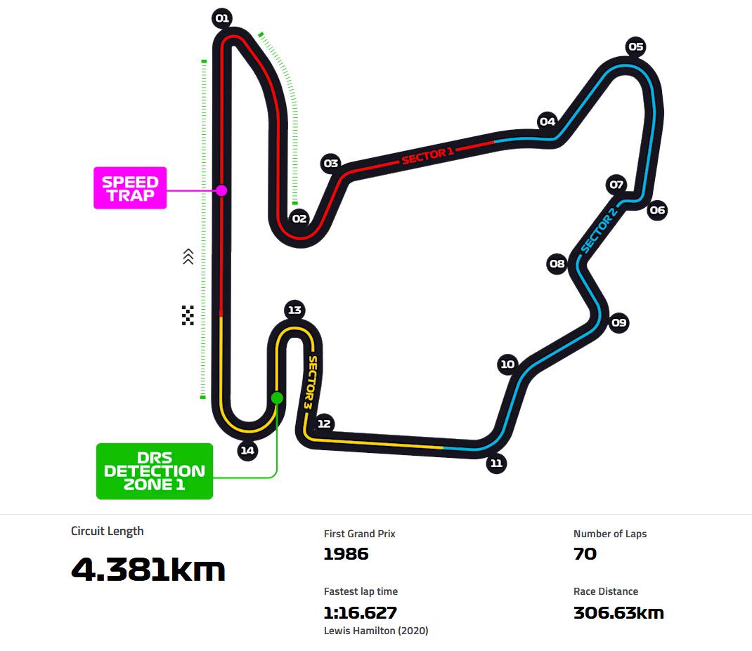 4.381km의 짧은 서킷임에도 불구하고 코너가 14개나 있기 때문에 코너와 코너사이의 거리가 매우 짧고 또한 긴 직선구간은 스타트 구간 밖에 없기때문에 드라이 조건에서는 추월이 상당히 까다로워 '건물없는 모나코' 라는 별명이 붙어 있습니다.