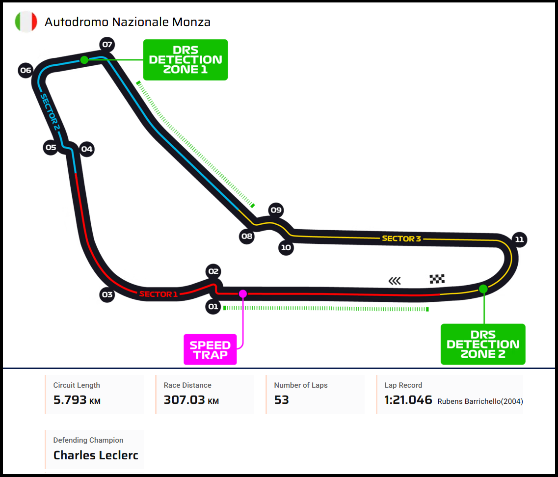 11개의 코너를 이루어진 5.793km 거리를 가진 몬짜 서킷은 서킷구조에서 보듯 2개의 시케인이 없으면 거의 직선구간과 완만한 코너 몇개로 이루어진 초소속 트랙임을 알수 있습니다. 또한 몬짜는 가장 위험한 F1 트랙중 하나이며 이곳에서 F1을 포함해 여러 모터스포츠에서 52명의 드라이버와 35명의 관중이 목숨을 잃었습니다.