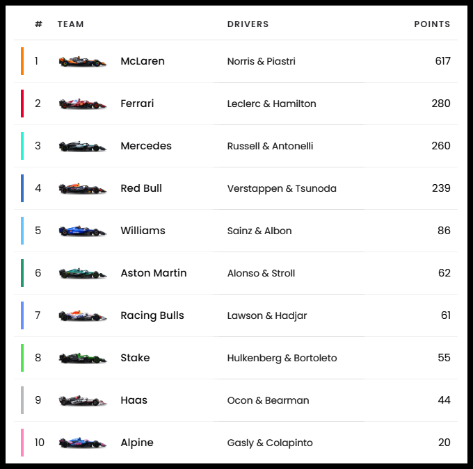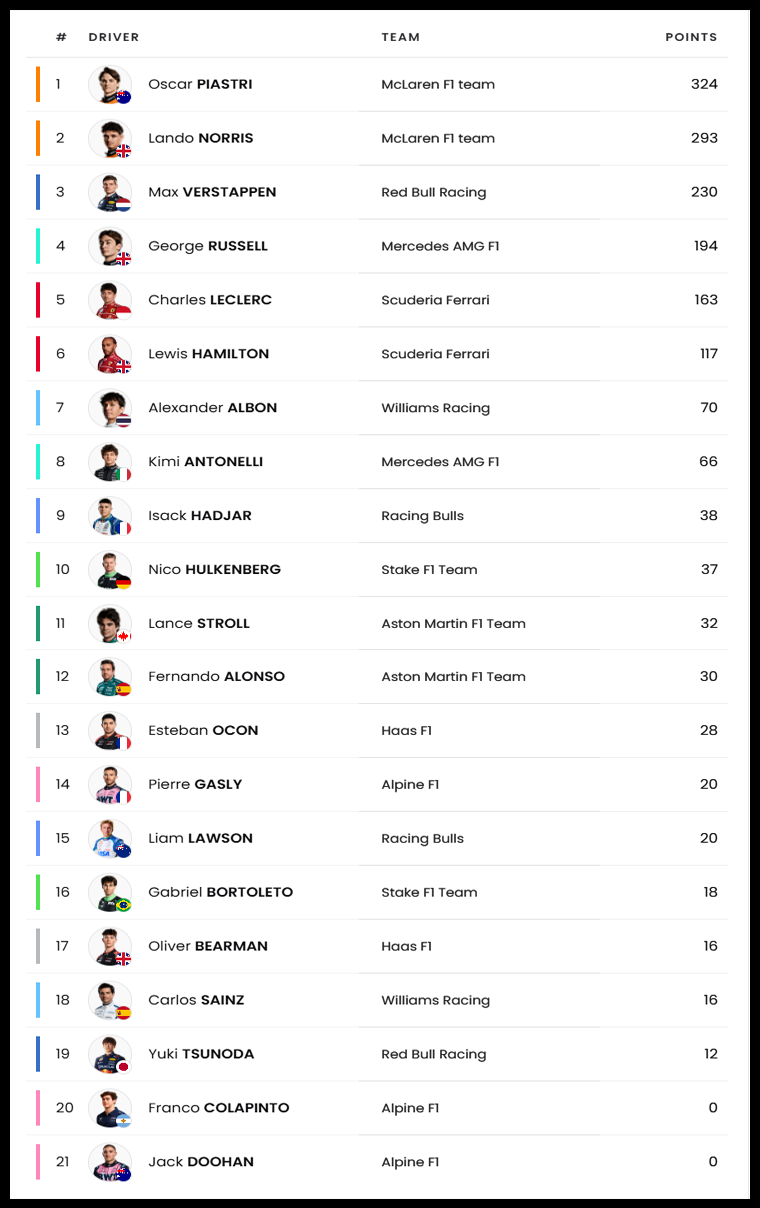 | 13 | 벨기에 GP | 베르스타펜 | 노리스 | 피아스트리 | 안토넬리 | 멕라렌 |