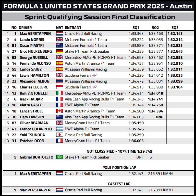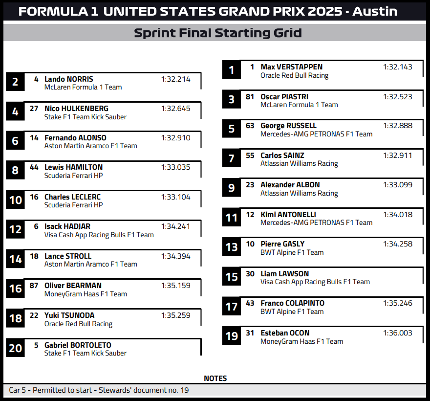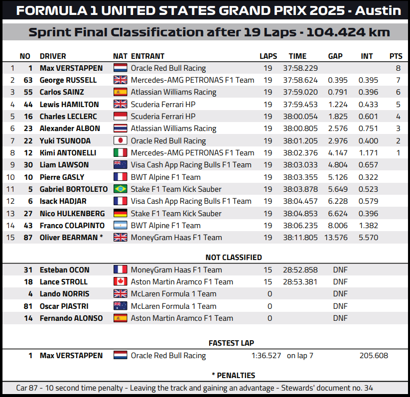F1.2025.R19 - 미국 그랑프리 스프린트 레이스 결과 (F1 2025 USA GP Sprint Results)