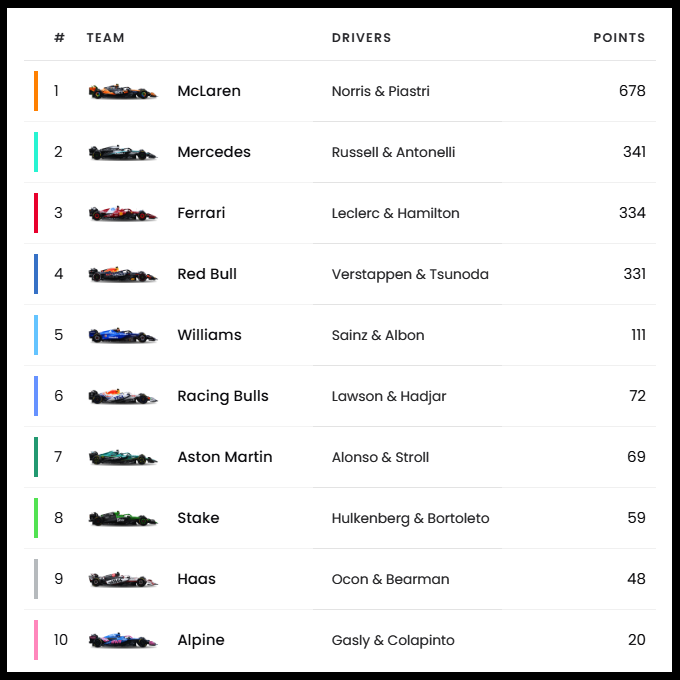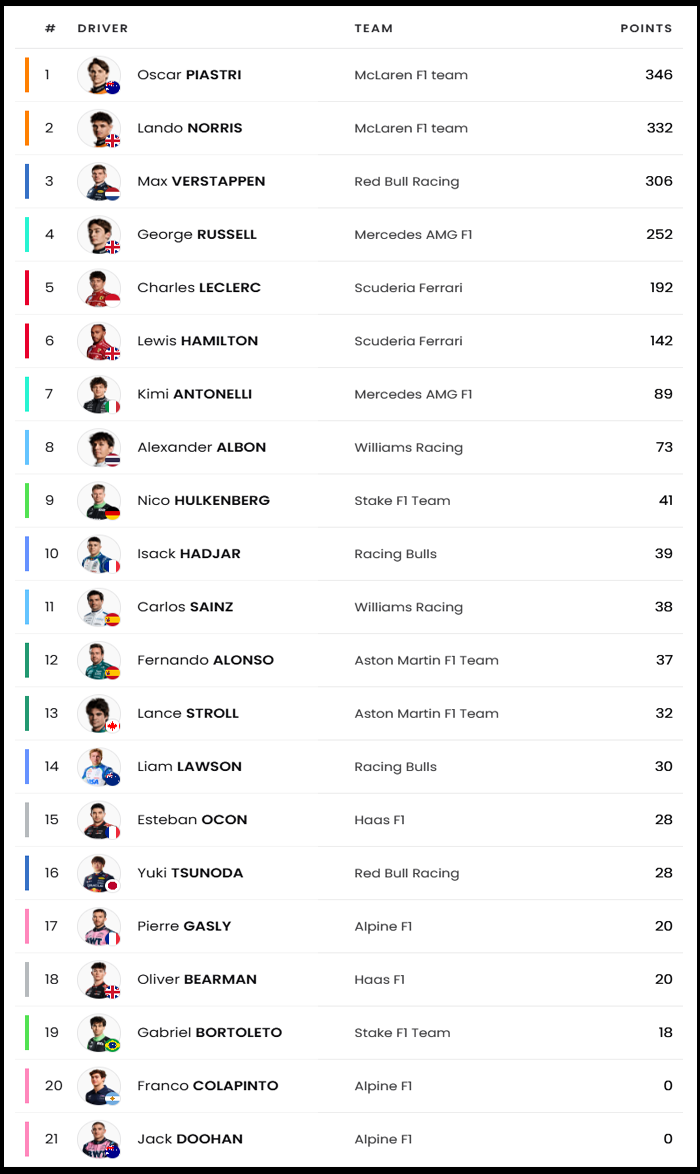 | 13 | 벨기에 GP | 베르스타펜 | 노리스 | 피아스트리 | 안토넬리 | 멕라렌 |