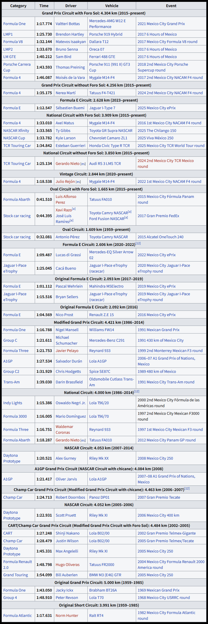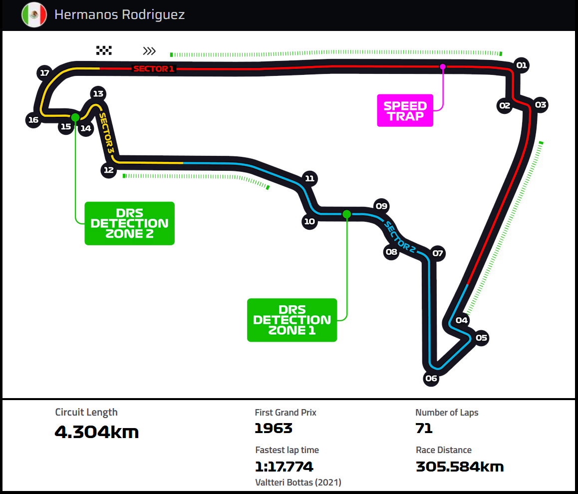 공기 밀도 20% 감소하는 고지대에 위치한 서킷으로 멕시코시티는 해발 2,000m가 넘는 고지대에 위치에 있기에 공기 밀도가 낮아 다운포스가 줄고, 엔진 터보 효율이 떨어지며, 냉각이 어려워지는 특성이 있습니다. 따라서 차량은 모나코급 다운포스 세팅을 사용하지만, 실제 주행 속도는 몬짜 수준으로 빠른 이색적 환경을 보입니다.