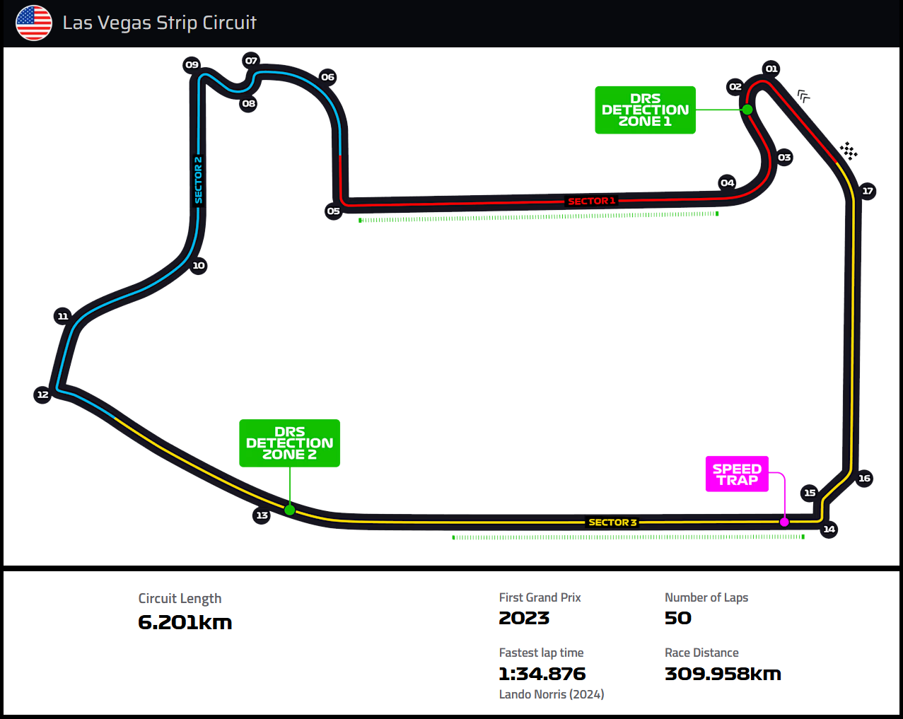 미국 네바다 주 라스베가스에 위치한 Las Vegas Strip 서킷은 17개의 코너와 1.9km의 직선구간을 가진 6.120km의 트랙으로 시계 반대 방향으로 진행되며, 속도는 가장 빠른 서킷으로 유명한 Monza와 비슷한 정도입니다.