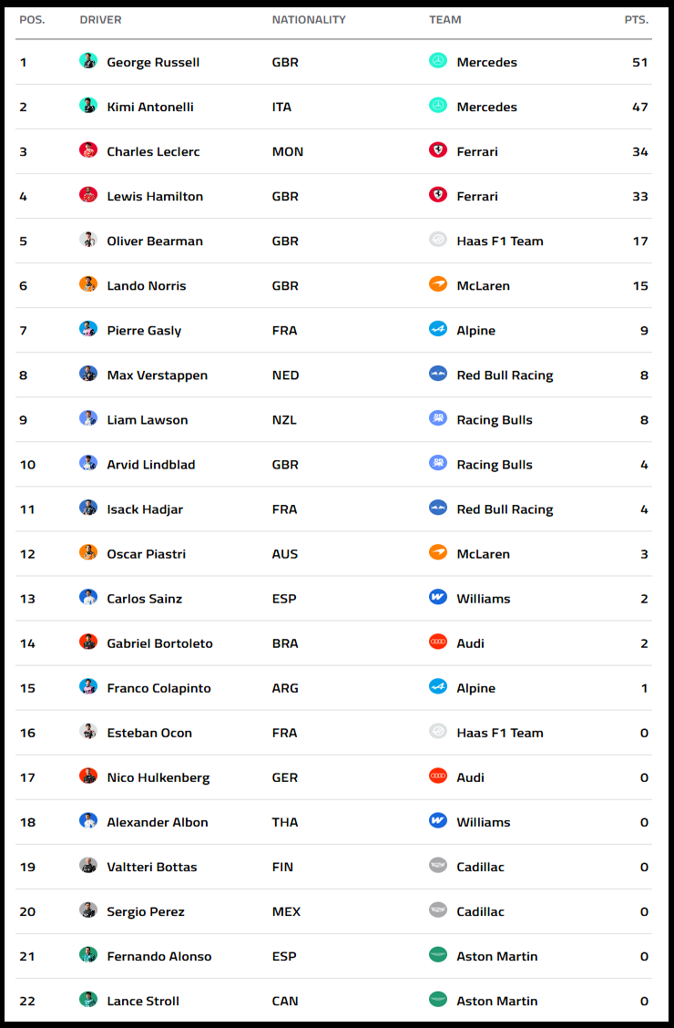 현재순위 안토넬리 해밀턴 르끌레르 러셀 콜라핀토 베어만 오콘 베르스타펜 가슬리 훌켄버그 린드블라드 로슨