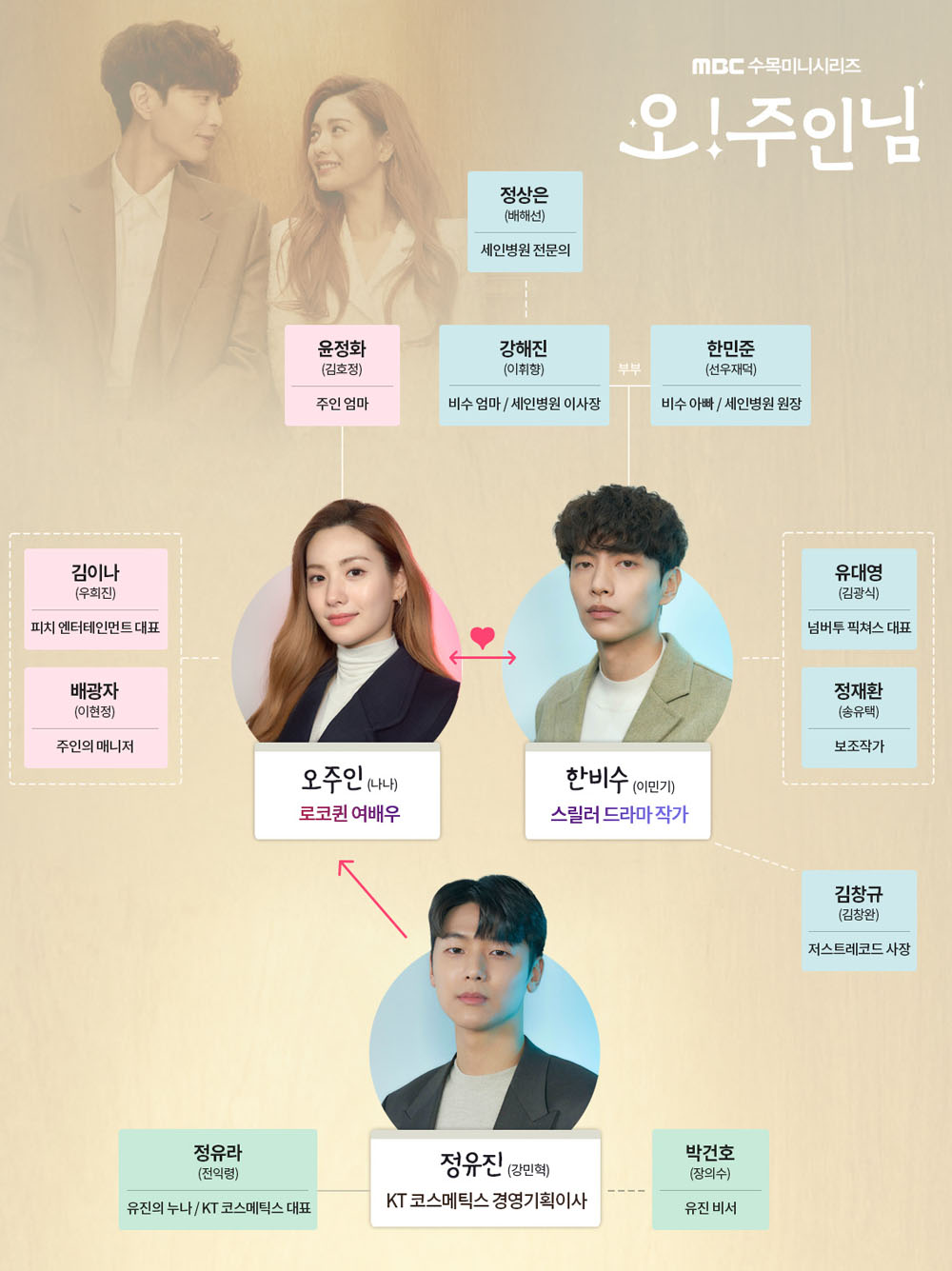 '오 주인님'은 2021년 3월 24일부터 MBC에서 방영되는 수목(밤 9:20)드라마로 연애를 '안' 하는 남자와 연애를 '못' 하는 여자의 심장밀착 반전 로맨스