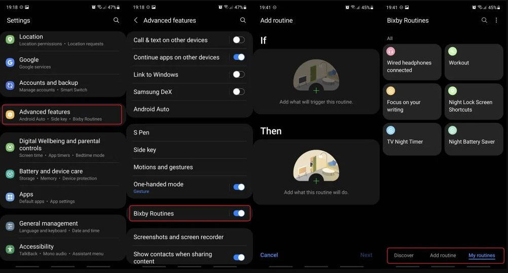 빅스비에서 사전에 정의된 루틴을 선택하거나 자신만의 루틴을 생성하려면 설정 앱을 열고 고급 기능으로 들어간 다음에 빅스비 루틴을 선택합니다.