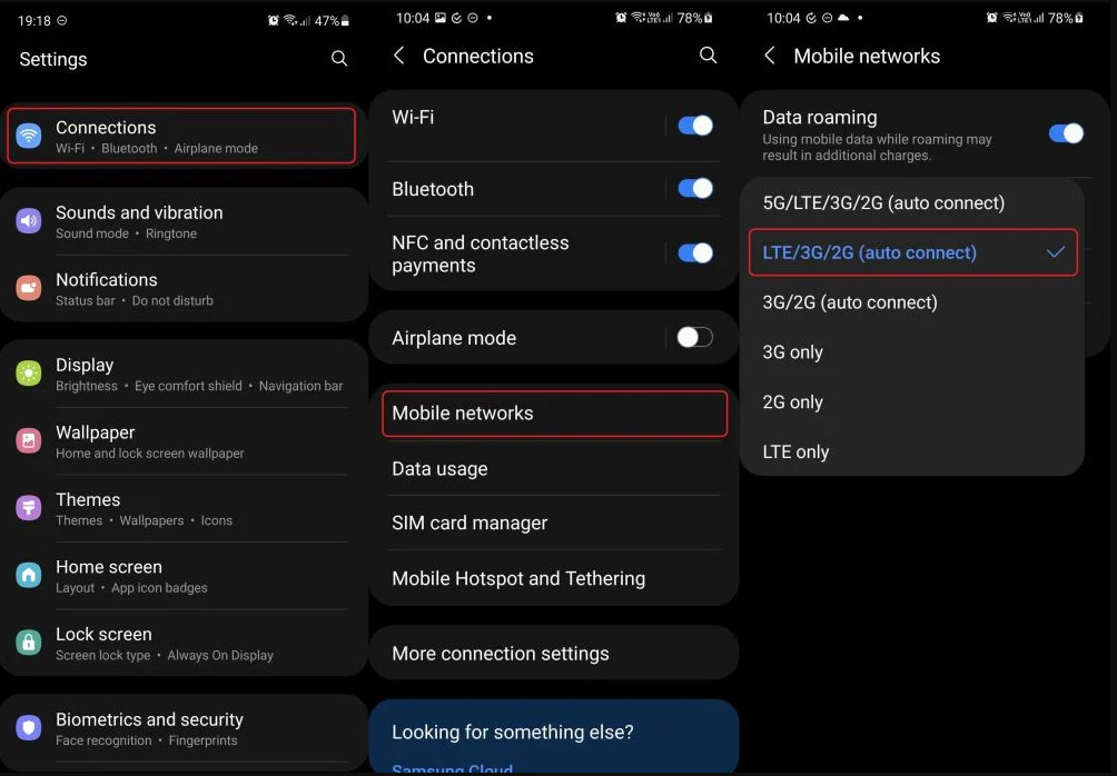 설정에서 연결 탭으로 들어가서 모바일 네트워크를 선택하고 목록에서 LTE / 3G / 2G 옵션을 선택합니다.