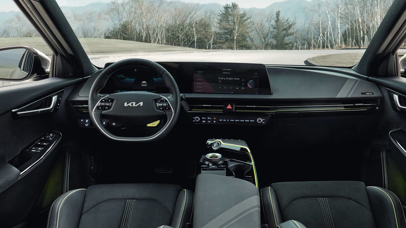 기아의 EV6 내부에는 한 쌍의 12인치 디스플레이가 있으며 운전 디스플레이와 인포테인먼트 패널은 곡선형이며 후자는 연결된 서비스와 무선 소프트웨어 업데이트가 가능합니다.