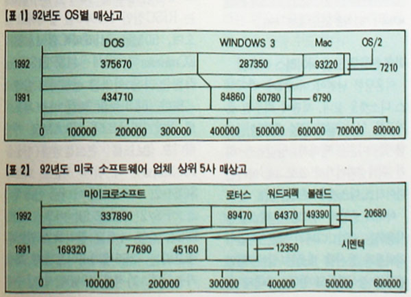 시장 조사 회사인 데이터퀘스트에 따르면, 윈도우 관련 소프트웨어의 매상이 91년 8억 4800만 달러에서 92년에는 29억 달러로 급상승 한 것으로 조사되었다. 이것은 전년 대비238%의 경이적인 신장율로(표 1), 덕분에 마이크로소프트사의 매상도 두 배로 늘어, 작년에 이미 33억 달러를 돌파했다(표 2).