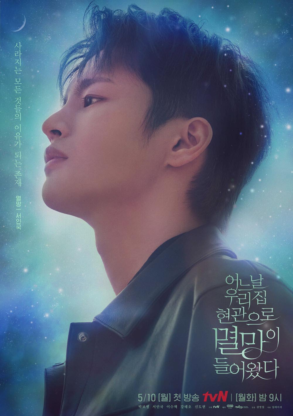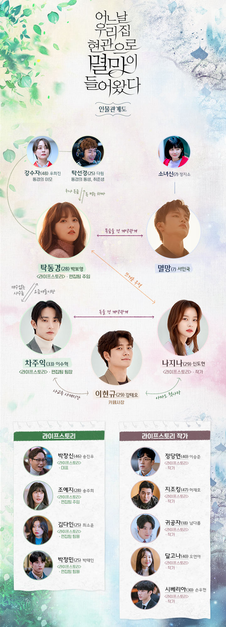 '어느 날 우리 집 현관으로 멸망이 들어왔다' 는 2021년 5월 10일부터 tvN에서 방영되는 월화(밤 9:00)드라마로 사라지는 모든 것들의 이유가 되는 존재 ‘멸망’과 사라지지 않기 위해 목숨을 건 계약을 한 인간 ‘동경’의 아슬아슬한 목숨담보 판타지 로맨스이야기다.
