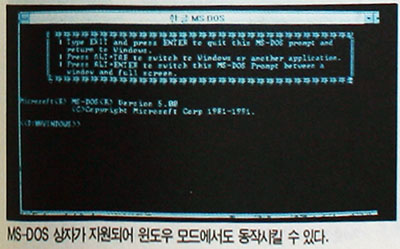 셋째로는 윈도우 모드의 MS-DOS 박스 지원을 들 수 있는데 사용자는 여러개의 MS-DOS용 응용 프로그램을 윈도우로 만들어 동시에 한 화면에서 동작시켜 작업할 수 있으며, MS-DOS용 응용 프로그램에서 작업한 파일 내용을 복사하여 윈도우 응용 프로그램에서 사용할 수 있다.