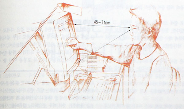 컴퓨터의 배치를 데스크 톱 형태의 배치로 하기 위해 모니터를 컴퓨터 위에 올려 놓았을때 화면의 상단부가 너무 높아지면 눈에 피로를 주게된다.