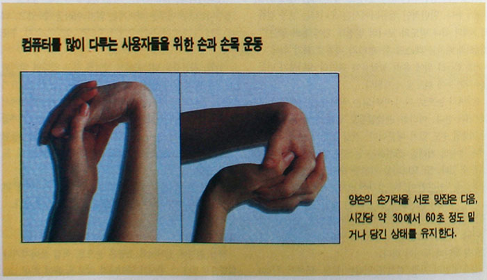 이는 몸을 같은 자세로 너무 오랫동안 유지시키지 않는 것이 좋다. 이럴때 편리한 것이 바로 키보드 앞에 놓는 손목 패드이다. 그러나 타이핑하는 동안에는 손목을 패드위에 올려놓고 쉬는 것이 오히려 문제가 생기기 쉽다.