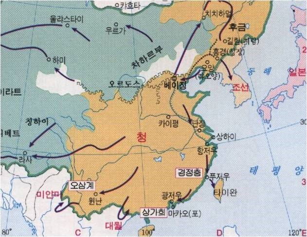 청은 이들을 회유하기 위해 남쪽지방에 이들을 왕으로 봉했다. 운남, 귀주의 오삼계, 광동의 상가회, 복건의 경중명 등이 바로 그들인데, 이들을 삼번이라고 한다.
