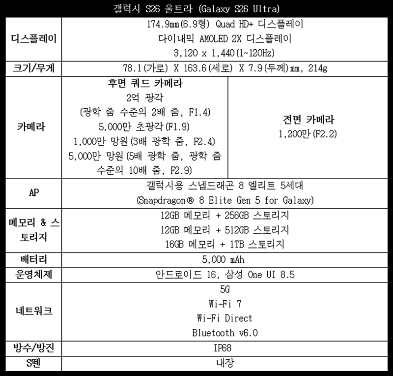 | 갤럭시 S26 (기본형 | 256GB: 1,254,000원 512GB: 1,507,000원 |